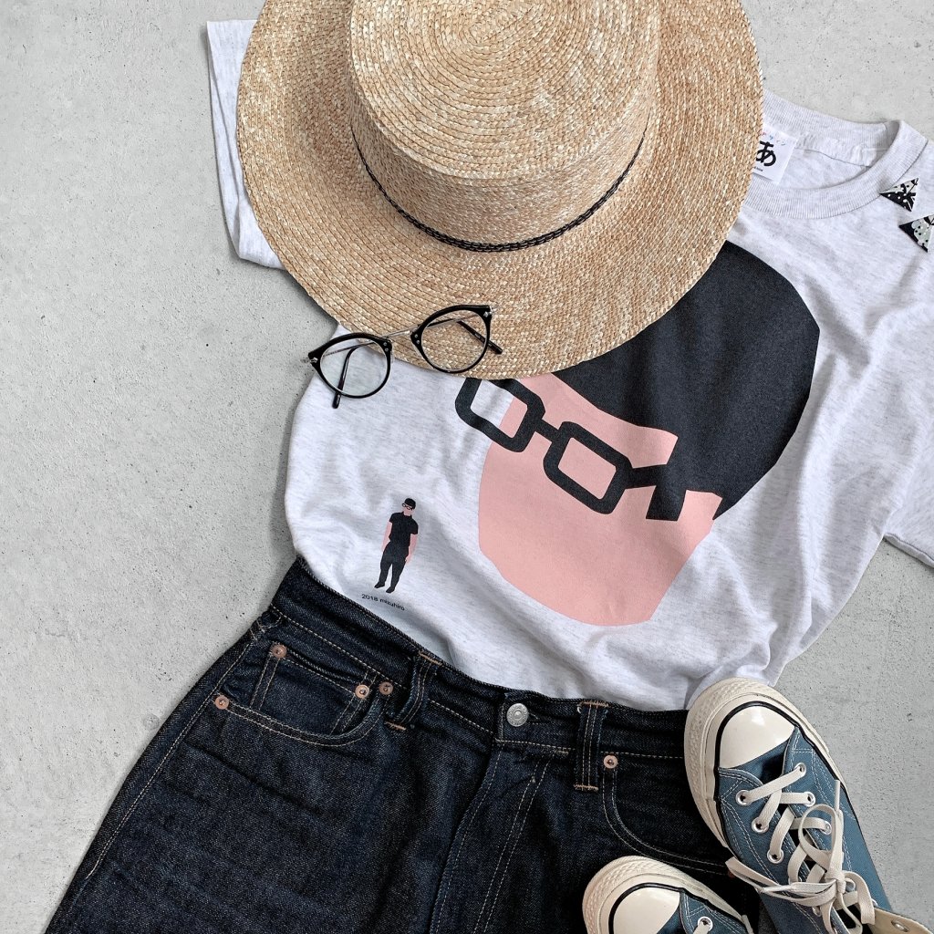 Tシャツ:デザインあ メガネ:EYEVAN ピアス:Flipps デニム:LENO&Co. スニーカー:CONVERSE
