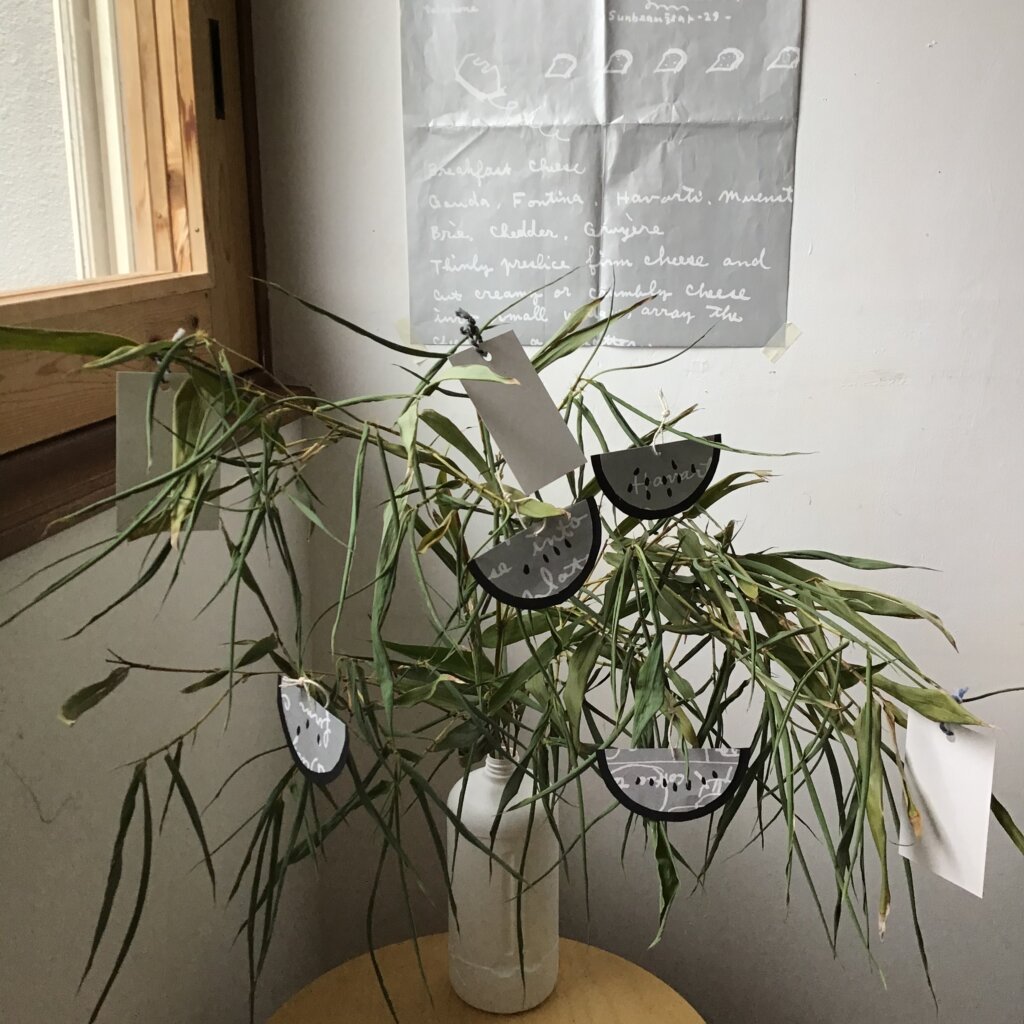 今年の七夕は、織姫彦星が会えないお天気となりました。 九州の方の大雨を心配しています。 七夕なので、笹を飾りました。 飾り付けはモーネ寺子屋で堀井和子さんの紙の コラージュワークショップに参加した時の 残りを使いました。。10年くらい前の話です。 堀井和子さんに習えたなんて凄い贅沢でした。 切り込み入れてアマの川はもったいなくて出来ず。。小皿をコンパスに円をくり抜いて2つに切り分け、スイカを作りました。