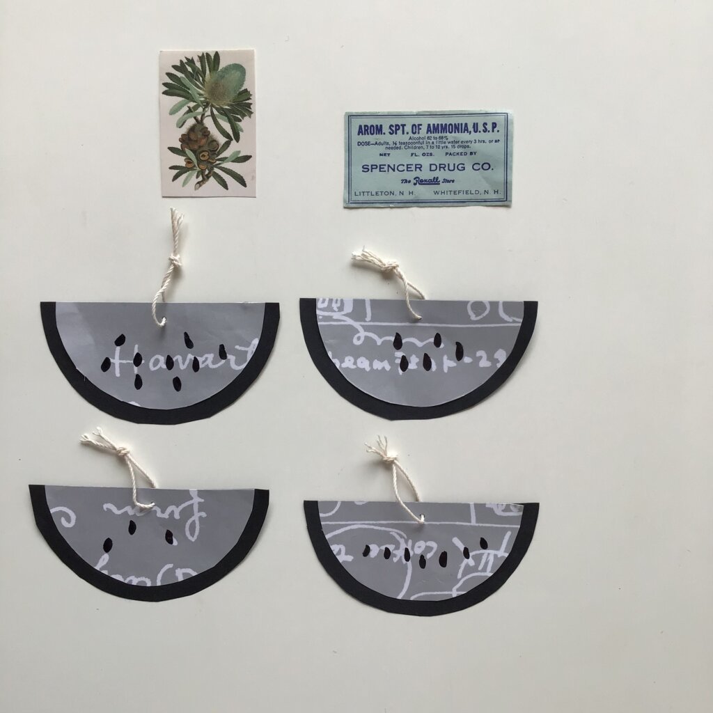 小皿をコンパスに円をくり抜いて2つに切り分け、スイカを作りました。