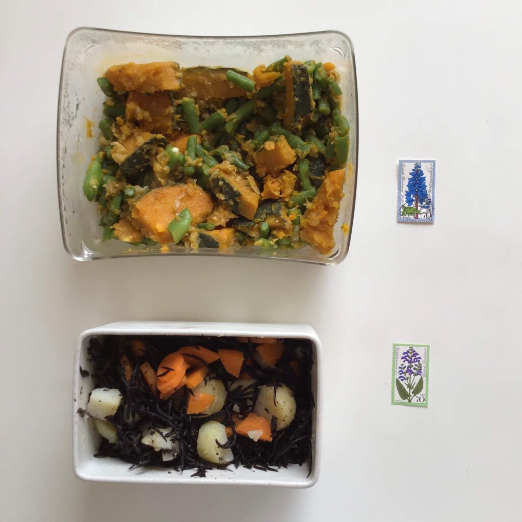 前沢リカさんの「野菜の料理教室」の大暑のメニューを 自分なりにアレンジして七夕のご飯にしました。 トップ画像の蒸し鶏と野菜をごまだれ素麺で頂きました。 ごまだれだけだとちょっと濃く感じましたが 素麺と三つ葉が絡んでくると美味しくて すごい勢いで食べました。その他作ったもの。 上 カボチャといんげんのスパイス煮 下 ジャガイモとひじきのサラダ