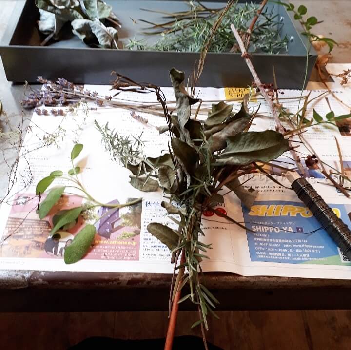 ライスフラワーの葉っぱなんかも混ぜたり、試行錯誤で作成中。。。