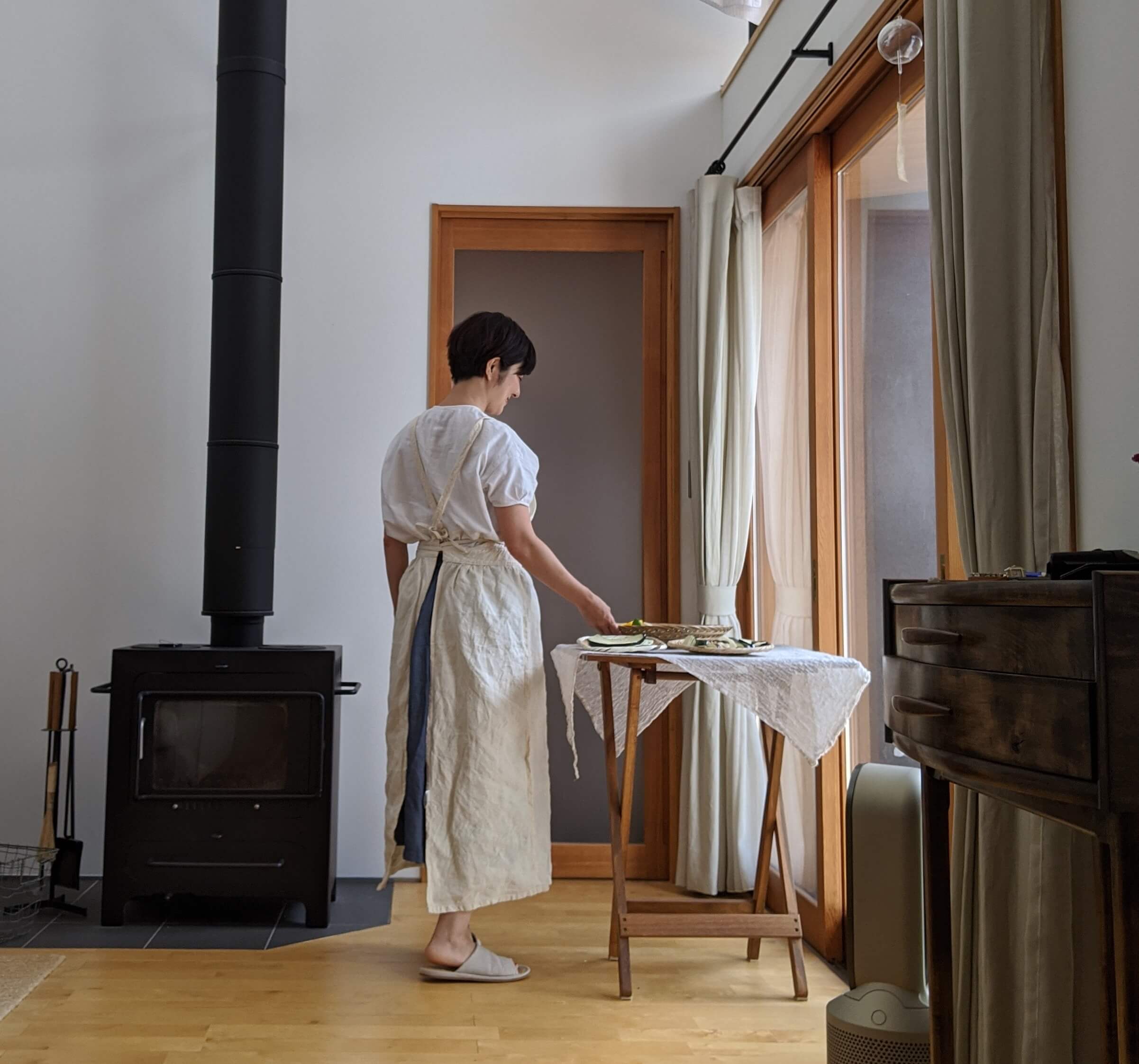 バッククロスタイプのエプロンを探していたら、tanpopoちゃんが素敵なのを着ている!
