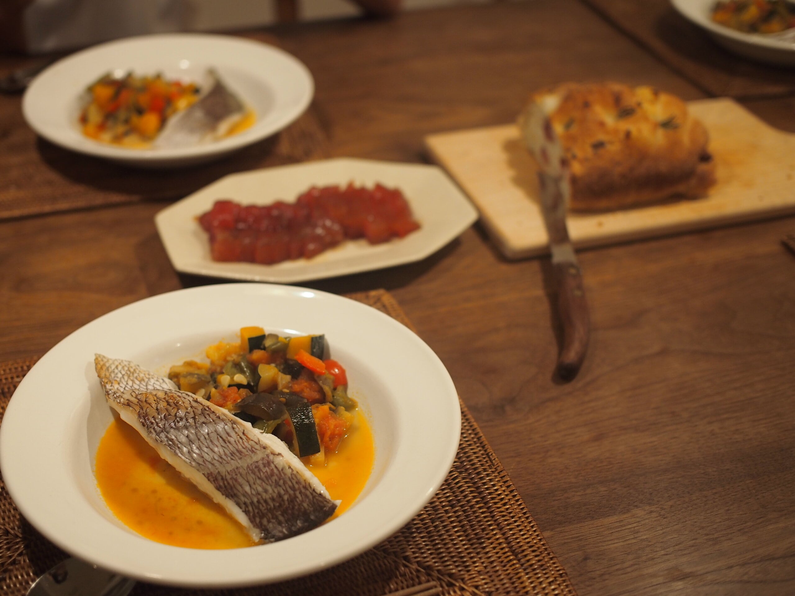 夜ご飯は、鯛のグリルにカポナータ添え、マリネは子ども達が食べないので、鮪の漬け?に白ごはん。