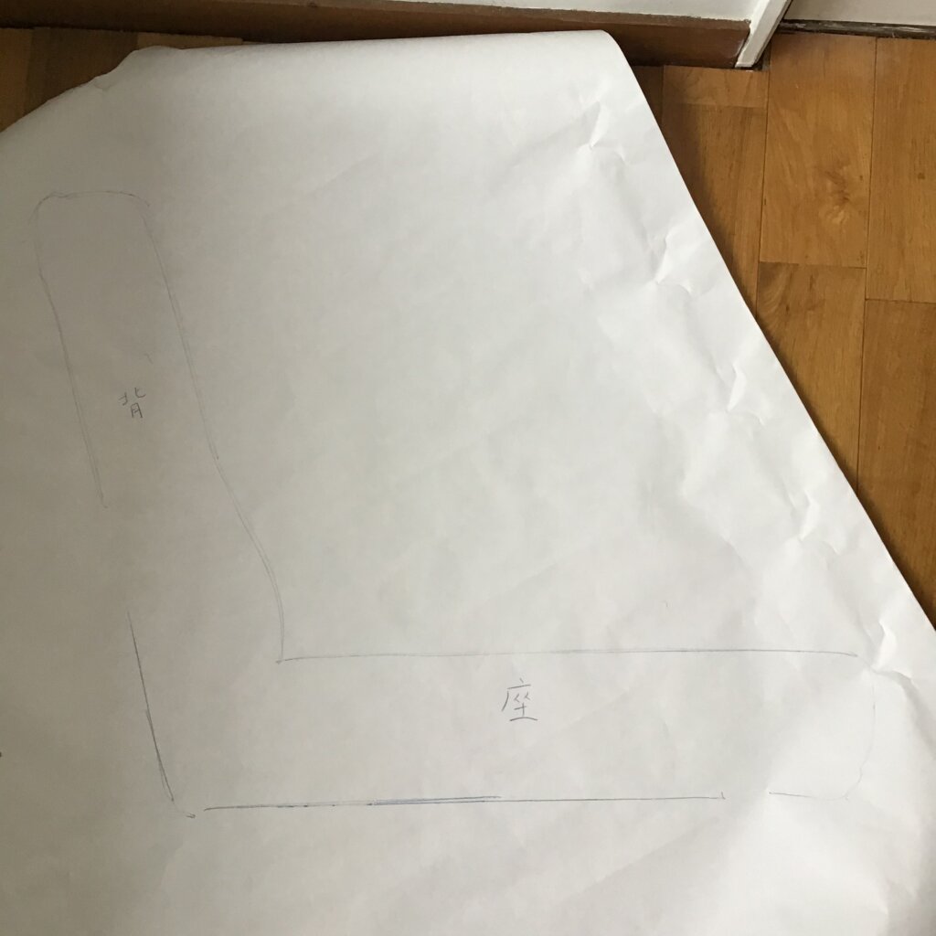 ソファの型紙はメジャーで測って製図してると 大変なので、模造紙に押し倒して^^;、色鉛筆で 型取りします。前のカバーを縫った時も このことを書かせていただいたような記憶が。。