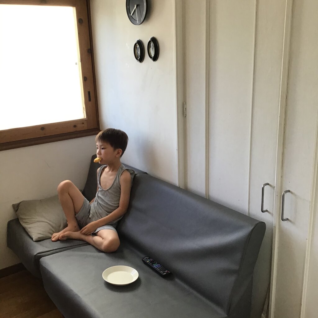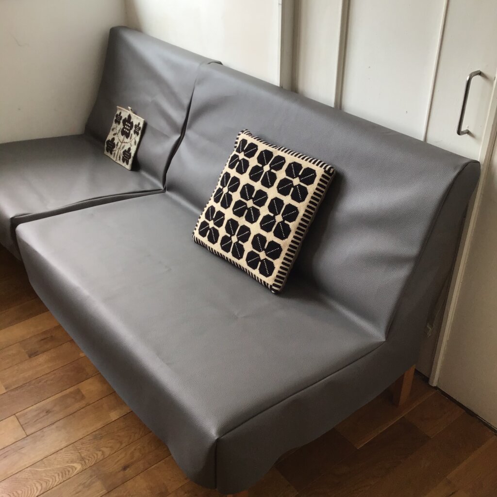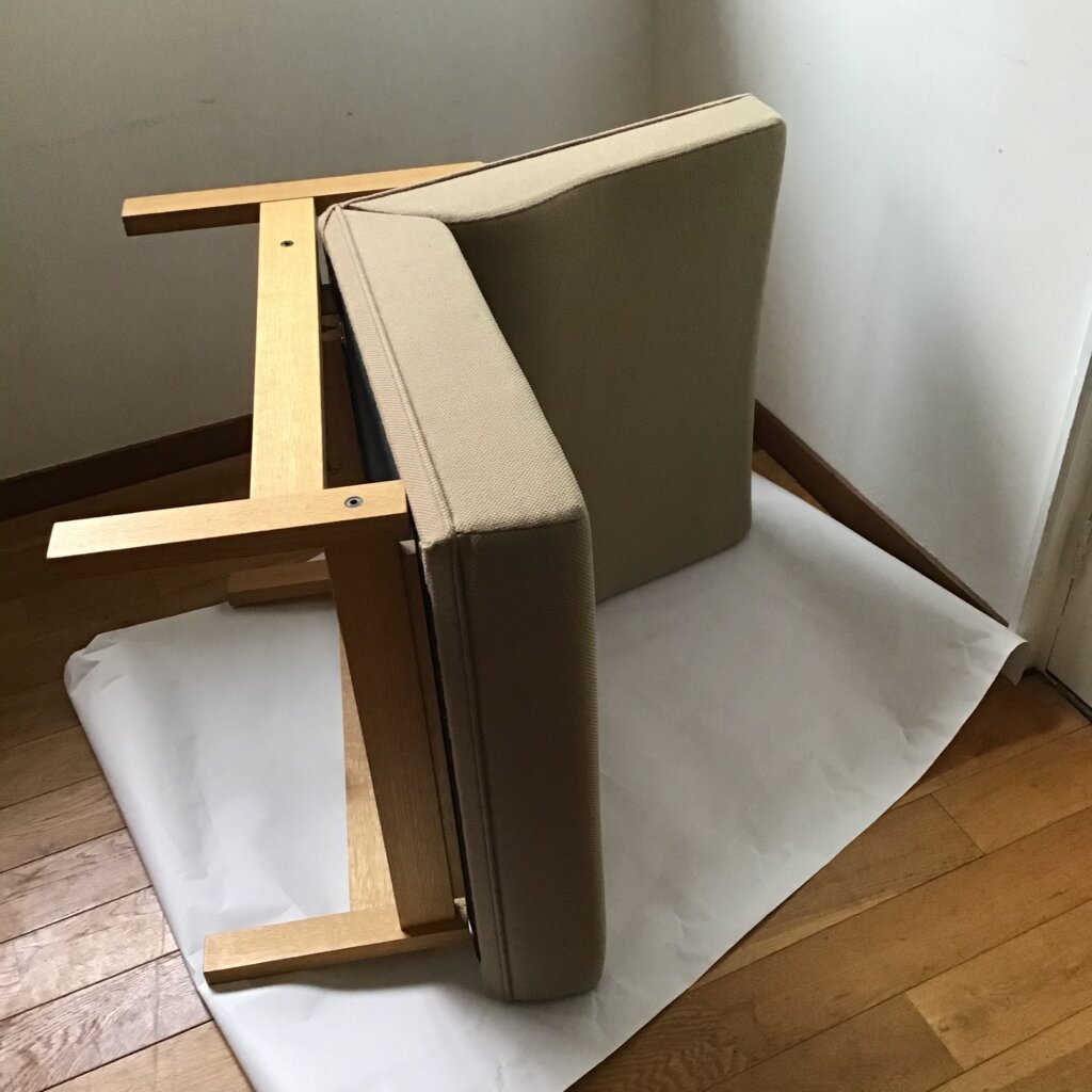 子供が生まれるまでは、ソファの座面が汚れることも ほとんどなかったのですが、ニ葉家具さんで生地を 選んで張ってもらった初期のシートは 子供の成長と連動して汚れていき、フェイクレザーで カバーを縫って被せていたのですが、それも、セロハンテープで 剥がれたところから面白がって、どんどん自分で剥がして 遊んでいました?カバー脱がせるとこんな感じです。やはりフォルムが ハッキリしていいな、と思うのですが、買った二葉家具さんに 張り替えを頼むのは息子が大人になってから。。 と思ってます。