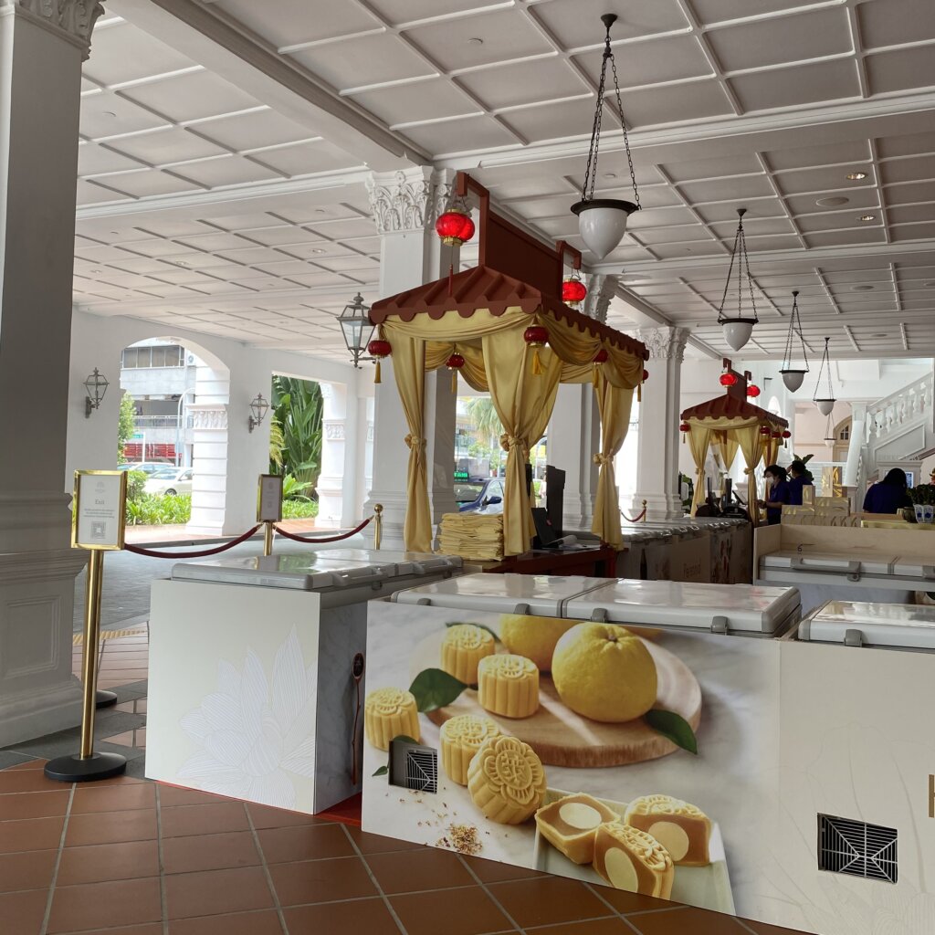Raffles Hotelに作られたムーンケーキ販売の特設会場。8個入りセットだけれど、少ない個数でも購入できるみたいです!
