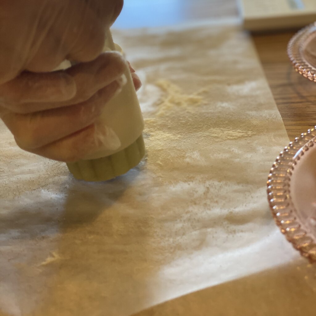 ムーンケーキの型にフィリングを入れて丸めた生地を押し込んで、型押し!