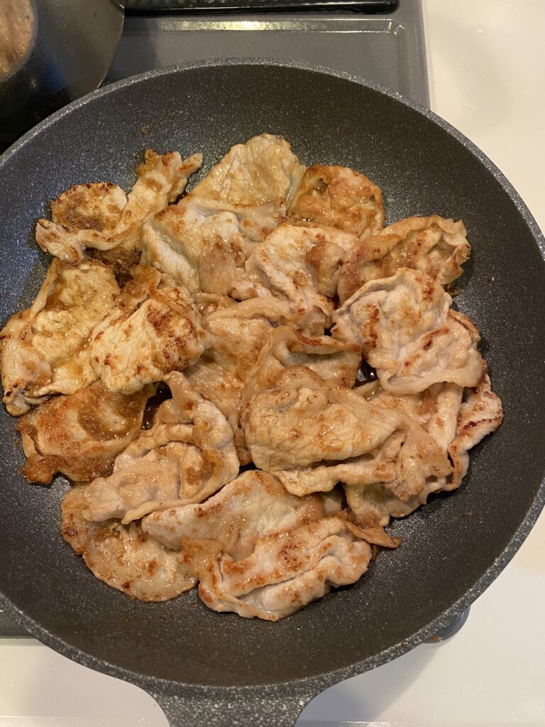 小麦粉をまぶした豚肉をフライパンに焼き付けて、最後にしょうが焼きのたれを投入!