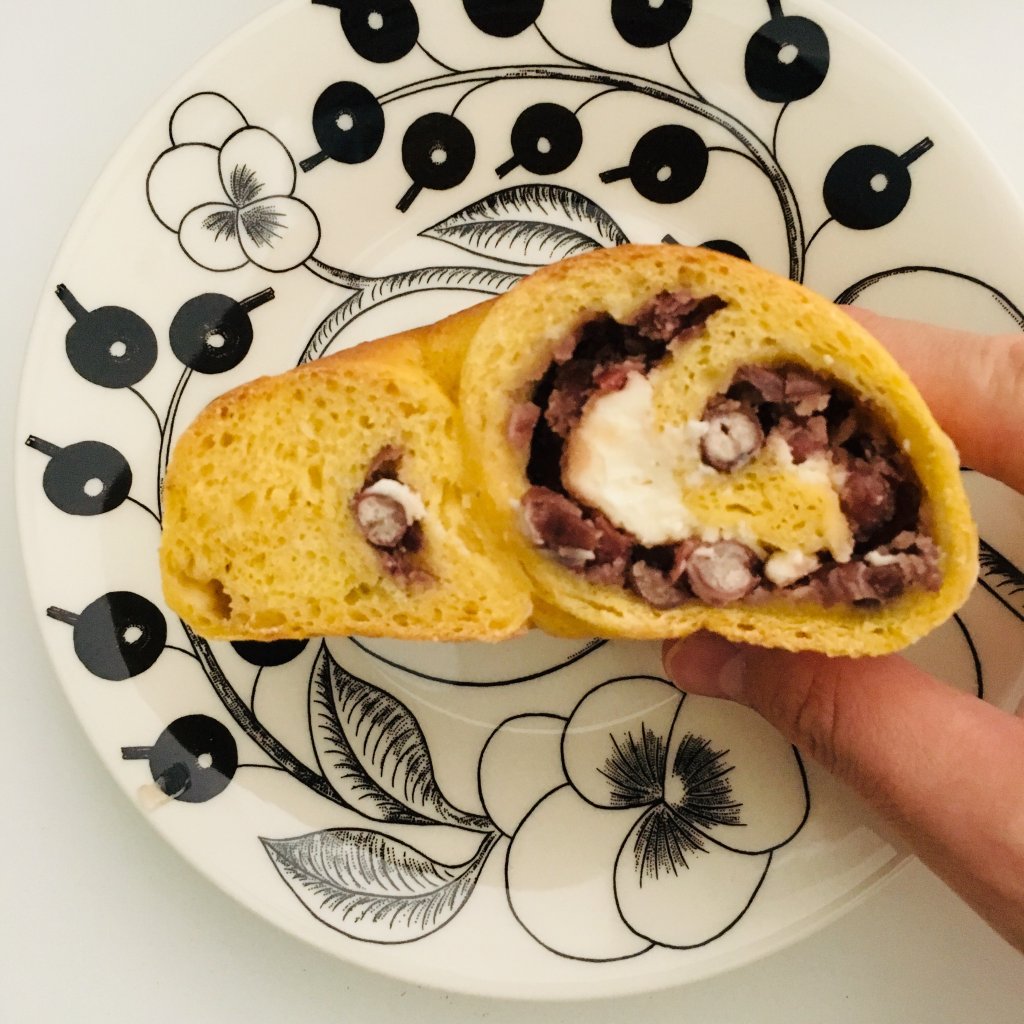 かぼちゃ餡の生地で、つぶあんクリームチーズのベーグル。