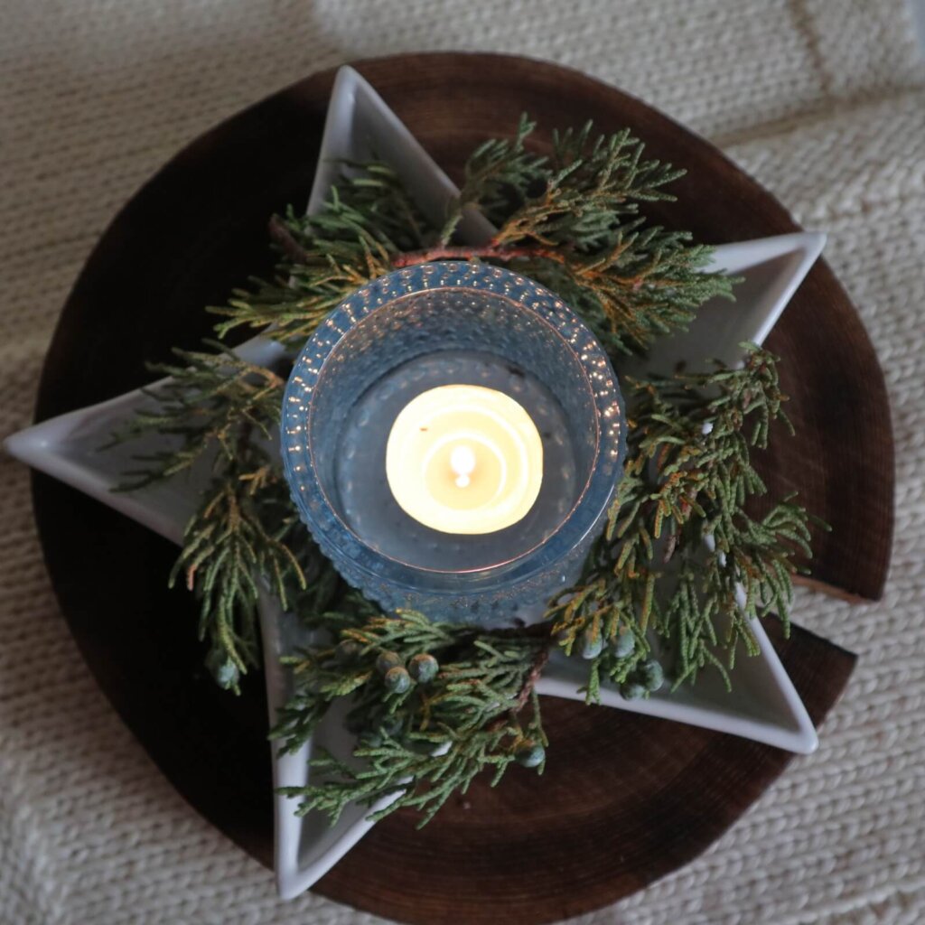 するとここにキャンドルを灯したらと思い、更にクリスマスの植物をと想像が膨らみ、家で花瓶に挿していたねずの枝をカットして飾ってみました。