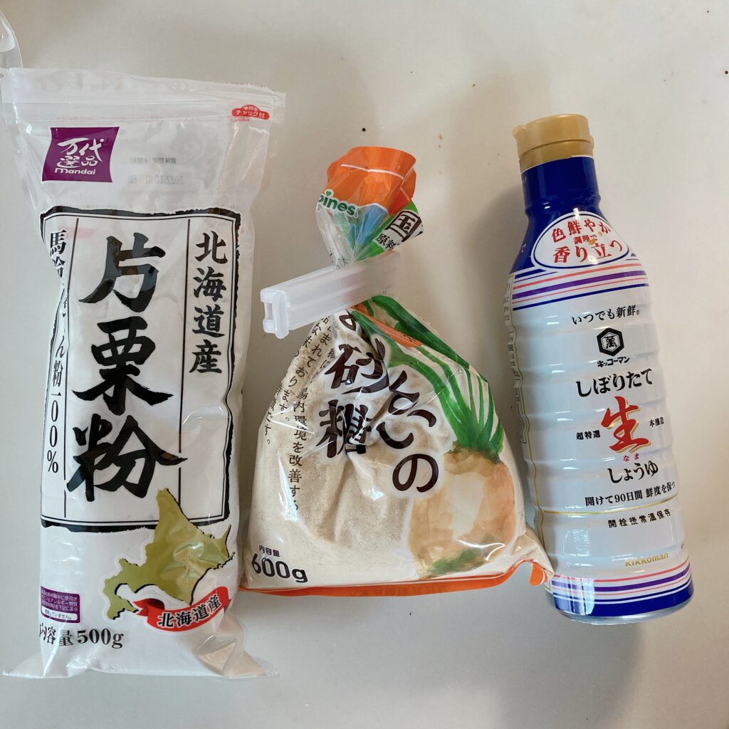 片栗粉1:砂糖2:醤油1にお水をいれて混ぜてから弱火で煮詰めます。