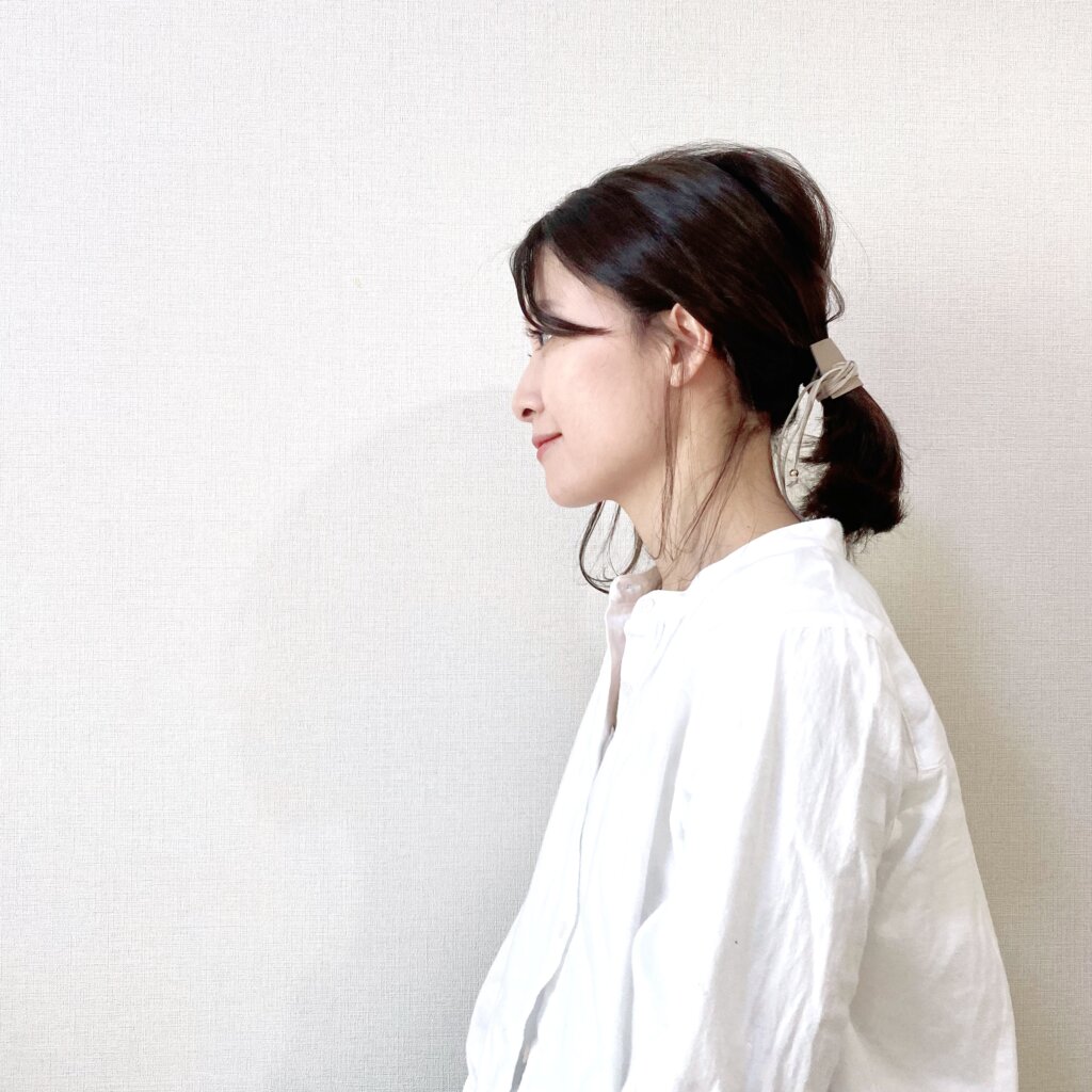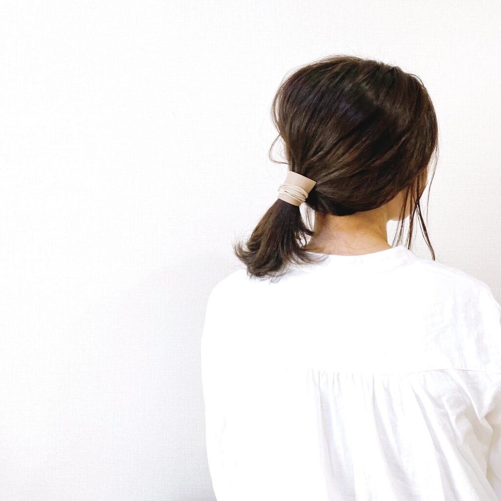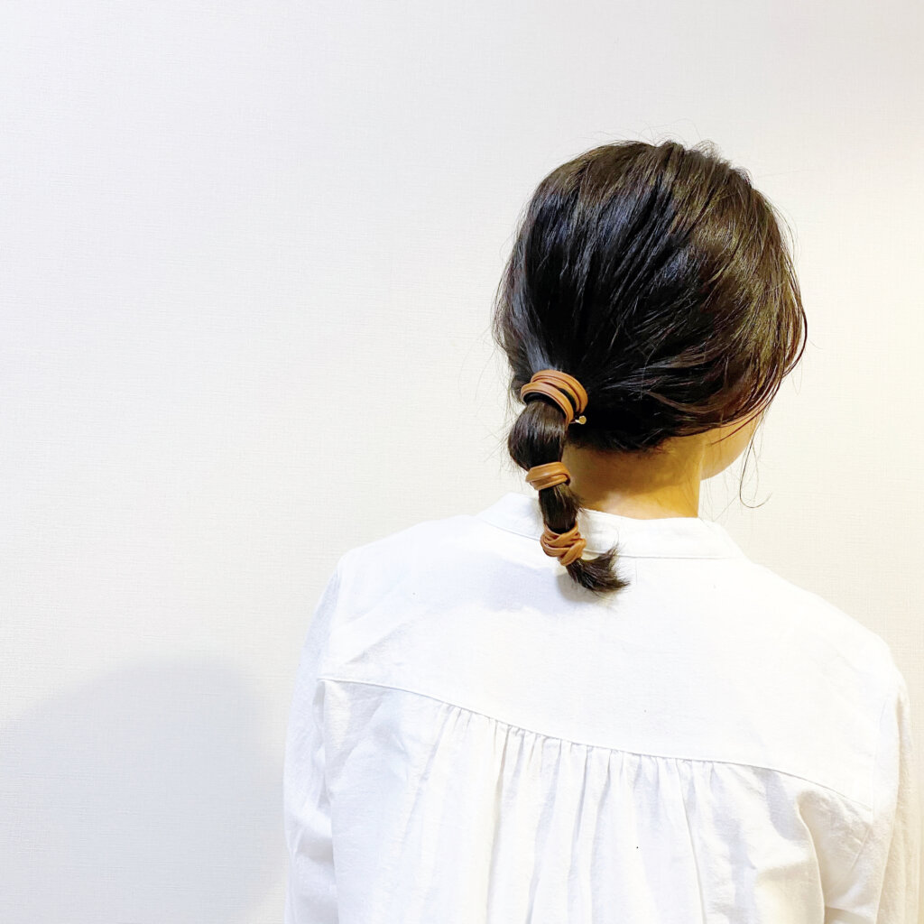 普通に結んでしまうと毛先の束感がなんとなく不自然だったので、丸く輪っかにして結びました。