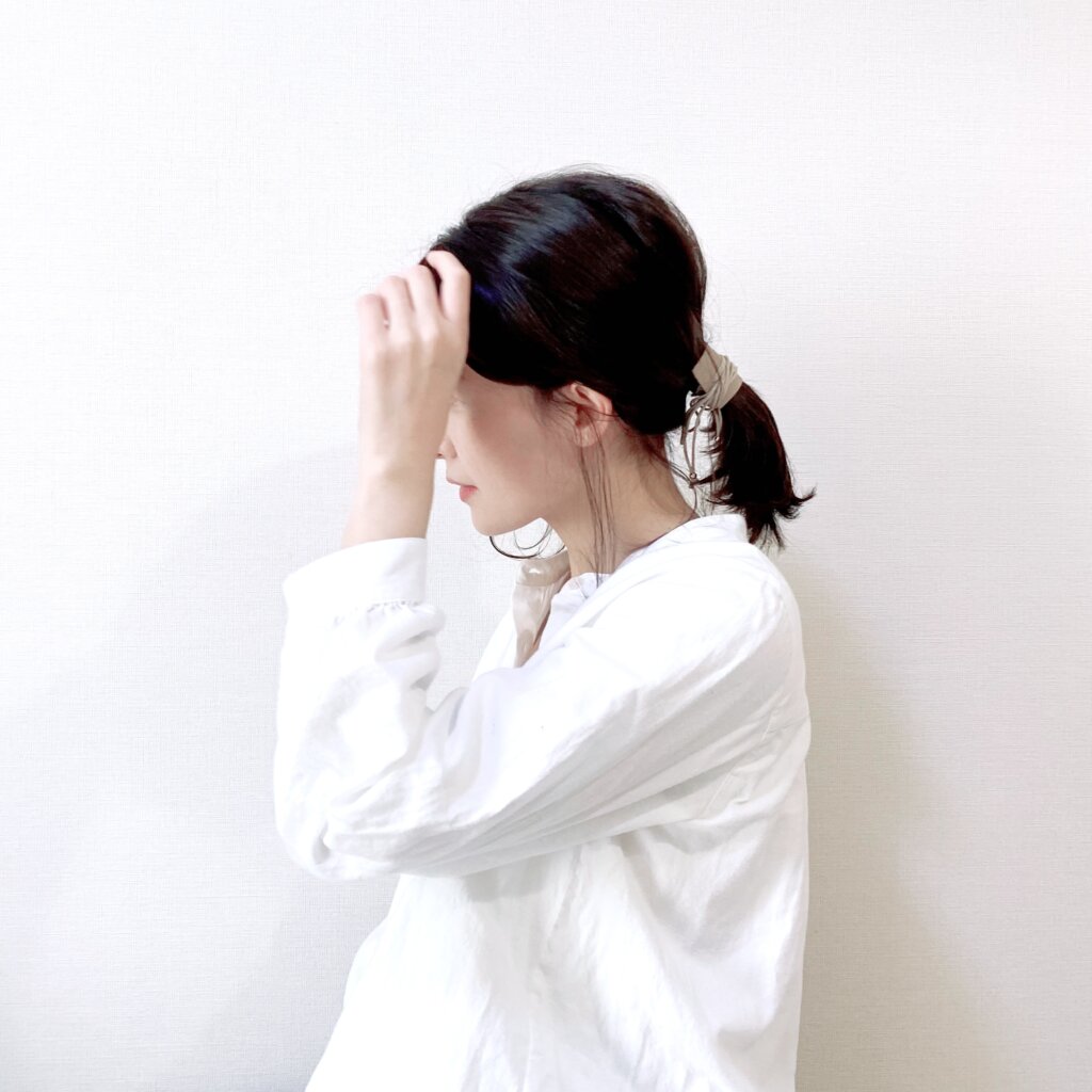 手グシでぐしゃっと一つ結びにして、結び目のサイドの髪を左右に引き出してふんわりな形にします。