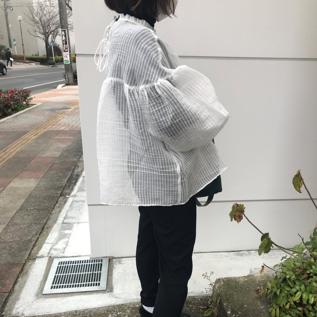 白ブラウスもインナーにブラックのハイネックなど合わせてもオールシーズンいけるかなと