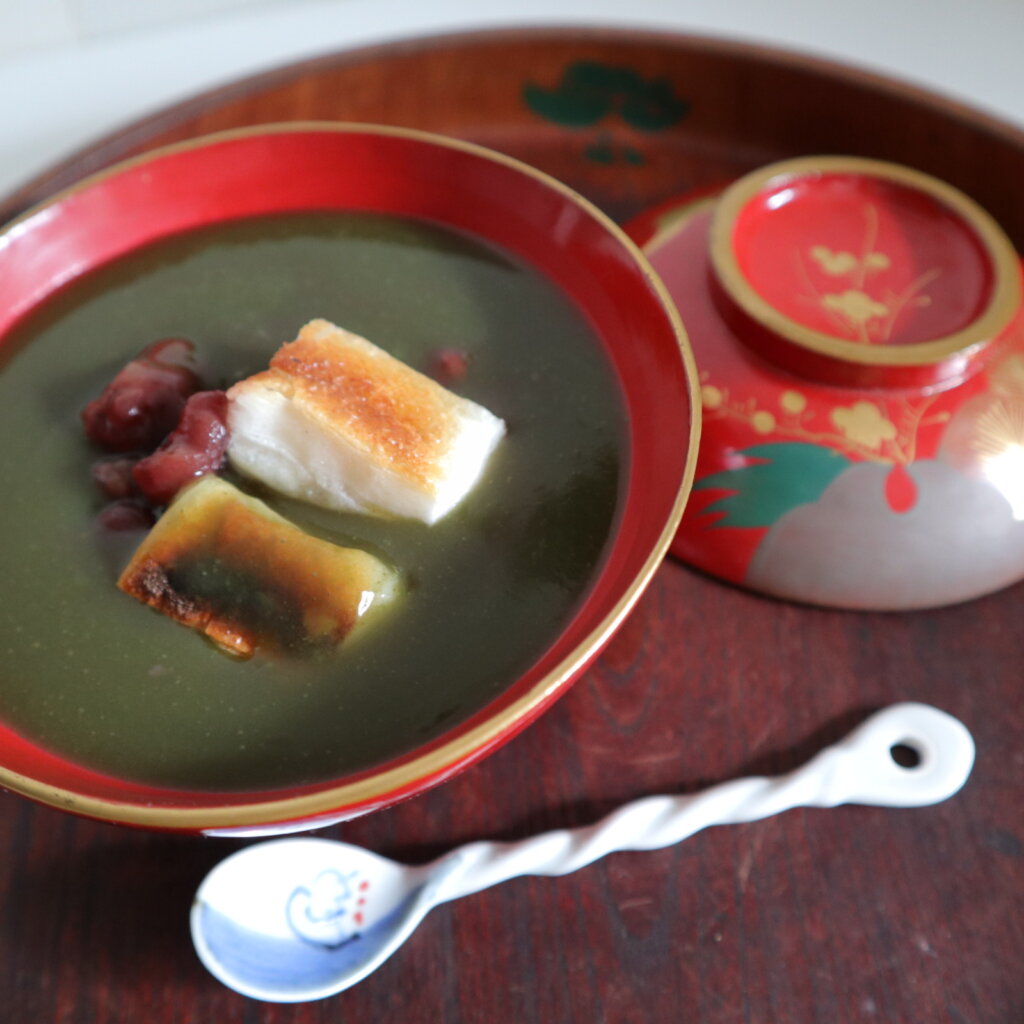いつもお汁粉で楽しむのですが、今年は甘さ控えめでさらっとした甘い抹茶の汁で楽しみました。