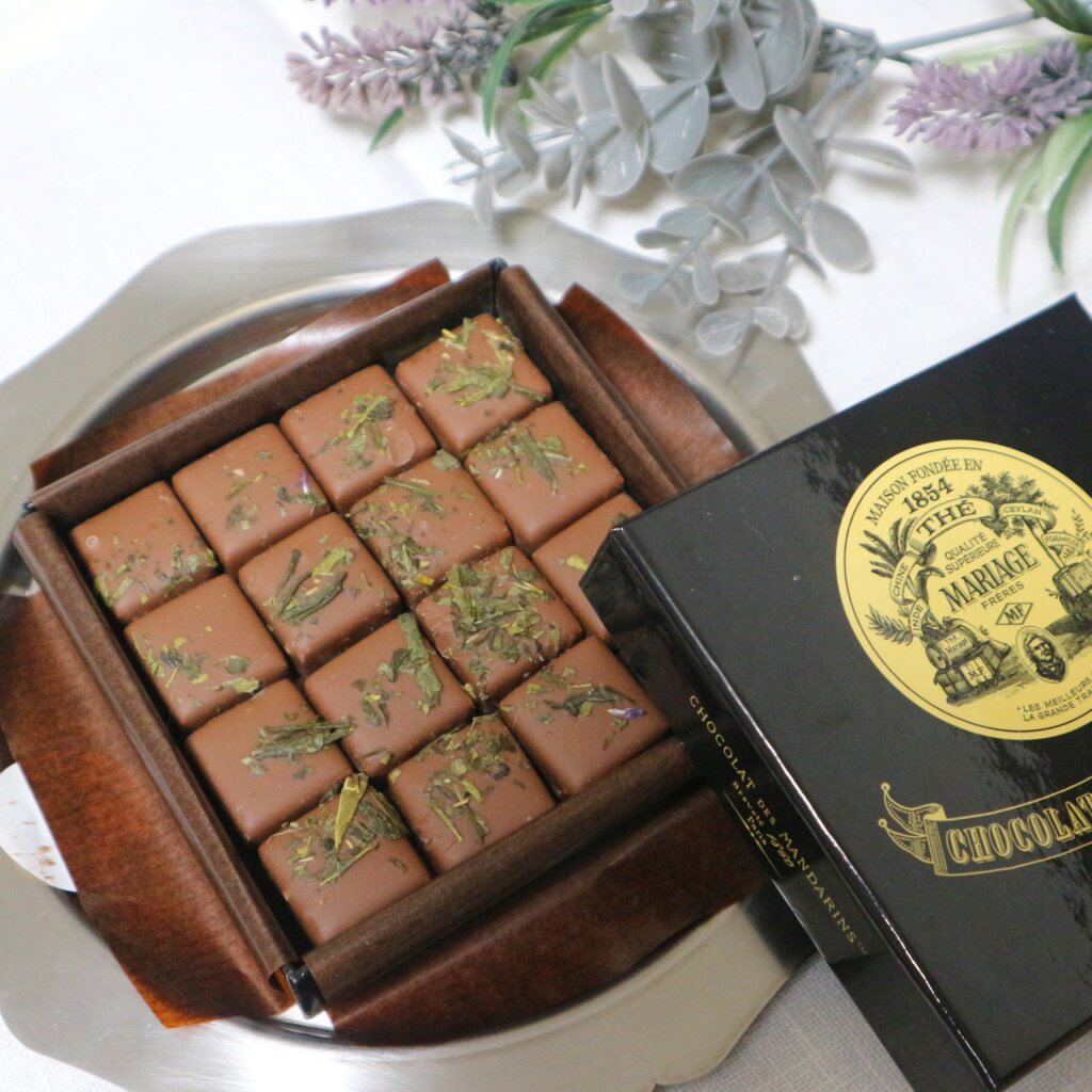 ショコラ デ マンダレンは茶葉を使ったガナッシュチョコレートで、贅沢にも上にはマルコポーロの茶葉がトッピングされています。