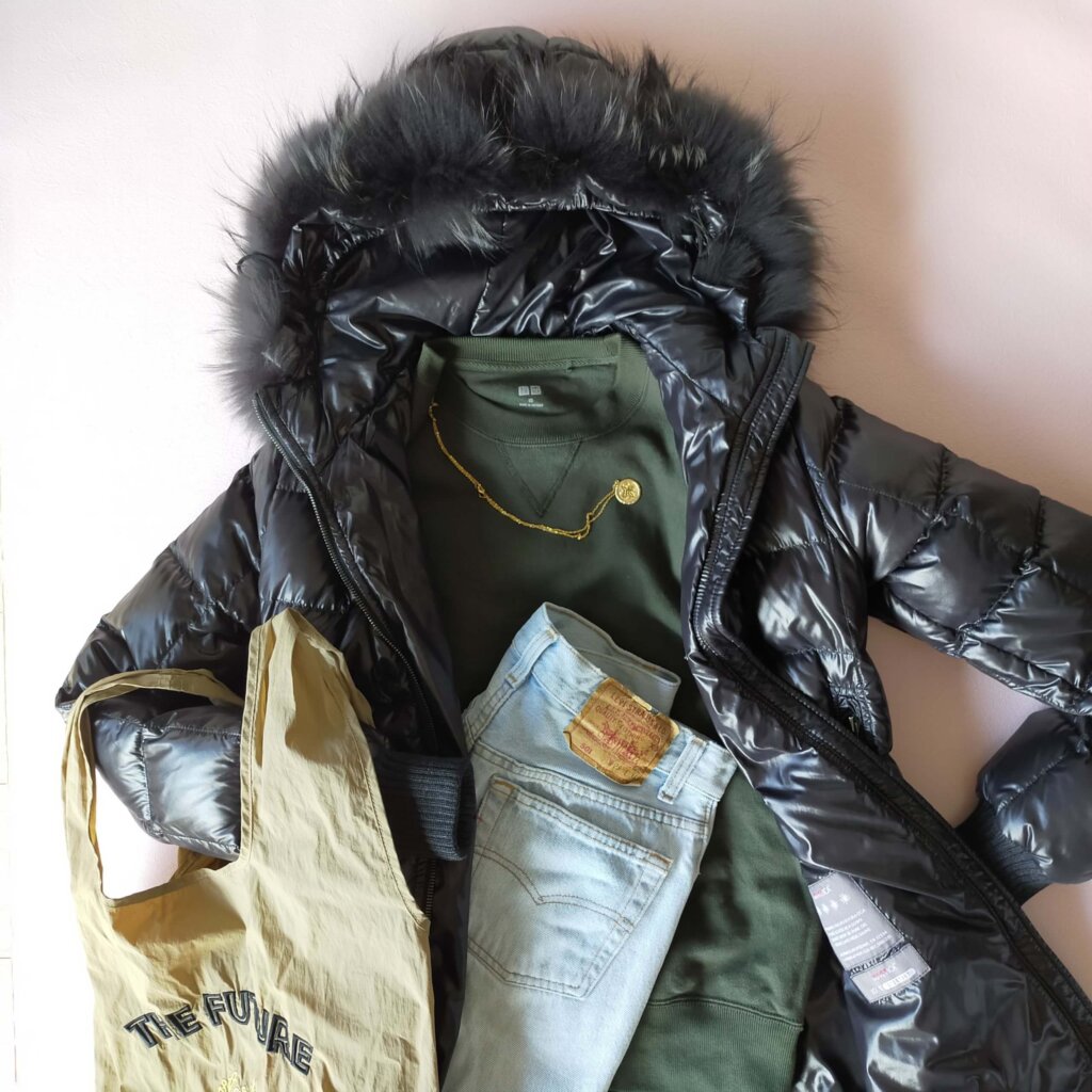 母のおさがりの高級ダウンに頼り切ったコーデ。母が細身なので、このダウンを着たければ一切太れない、買い直す資金も自分にはない、という身が引き締まる1着です。