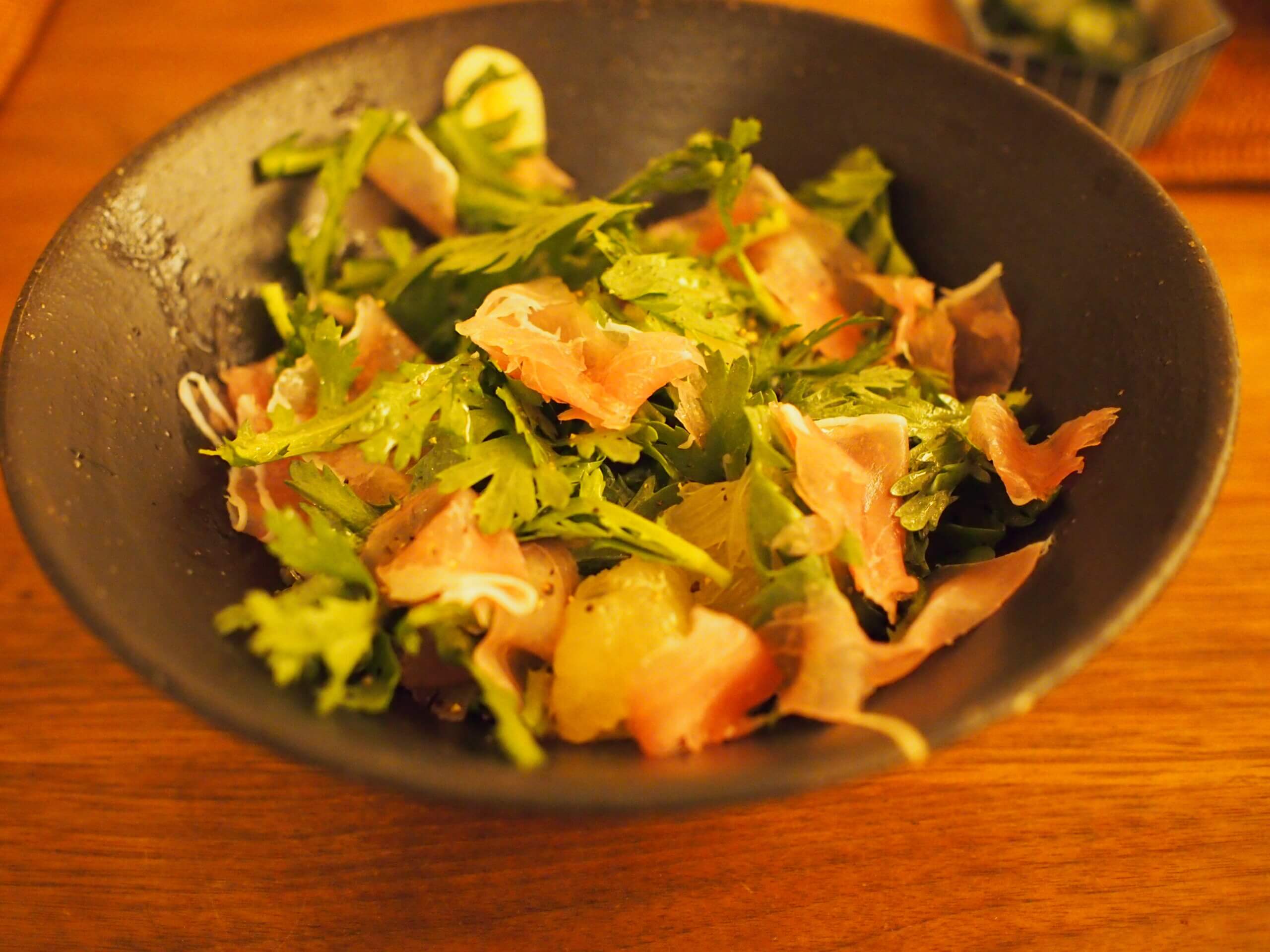 3 春菊、文旦、生ハムサラダ、オリーブオイル、塩、こしょうで。