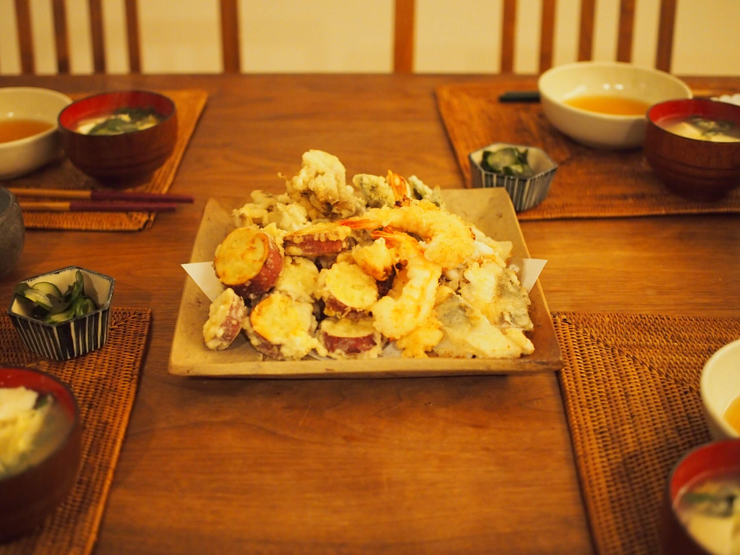 1 山盛り天ぷら(さつまいも、スナップエンドウ、エリンギ、タラ、エビ)