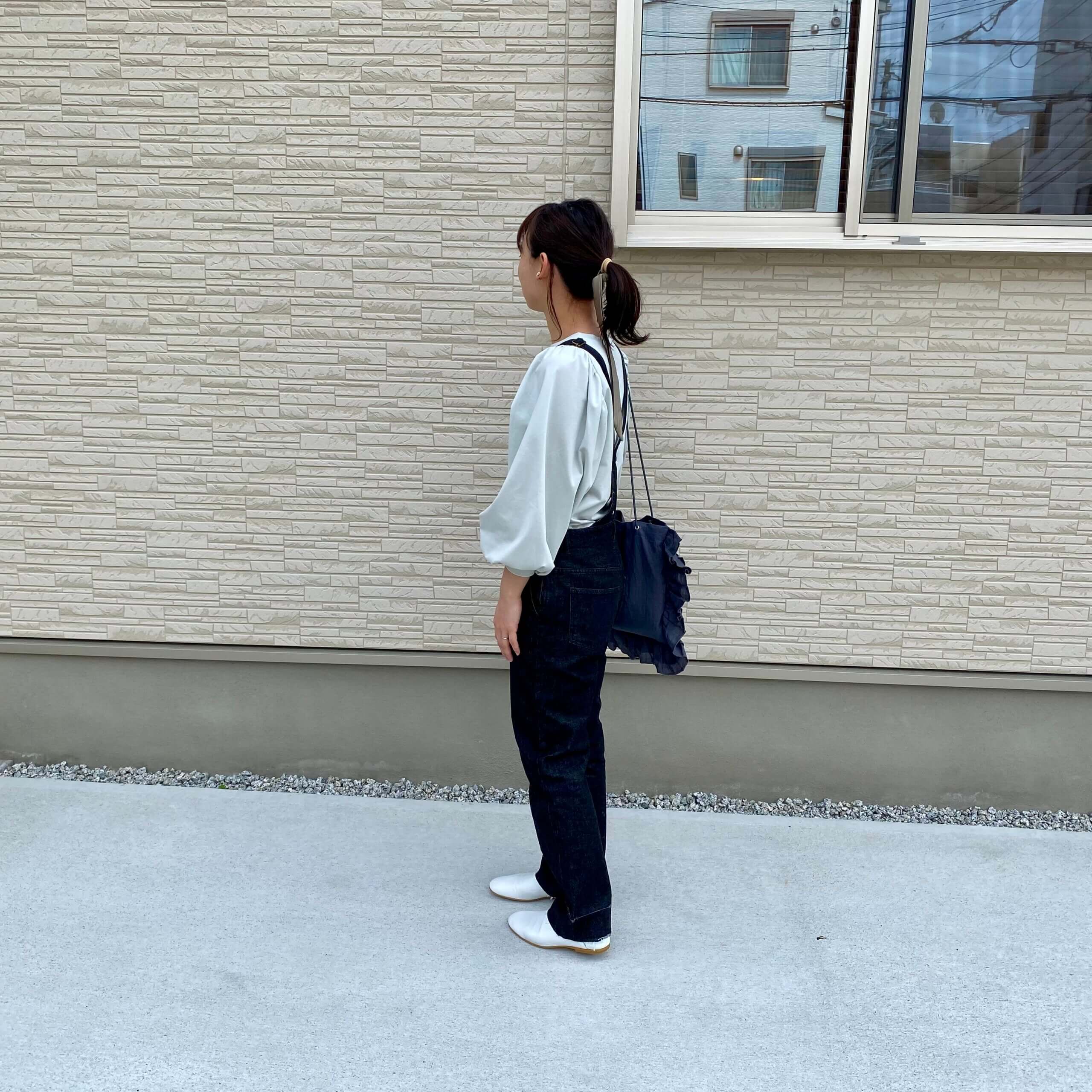 サロペット×袖ぽわんTシャツコーデ。