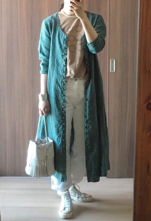 白のリネンパンツと足元はローファー。
