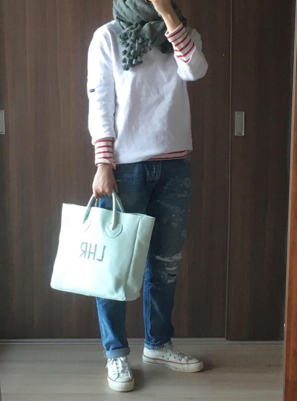 ボーダーとデニムの定番スタイルに