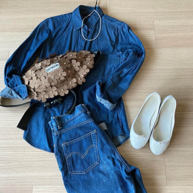 ユニクロユーのデニムのシャツ重ねて