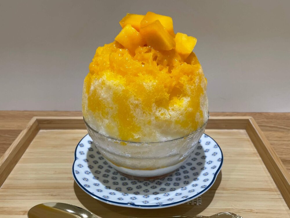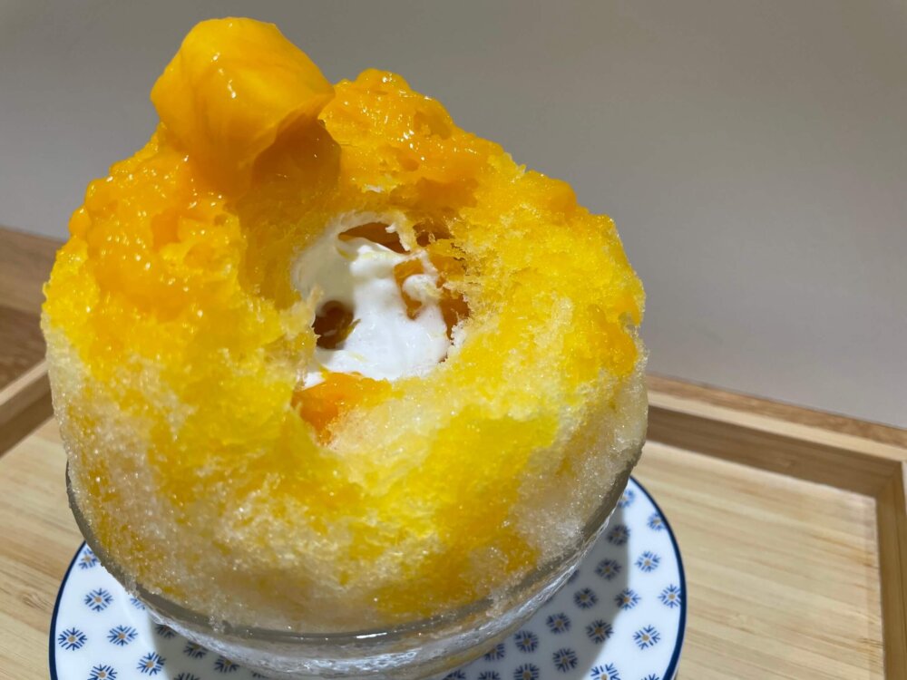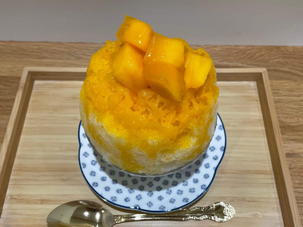 マンゴーの大きな果肉がフワフワのかき氷の上に絶妙なバランスでのっかっています。
