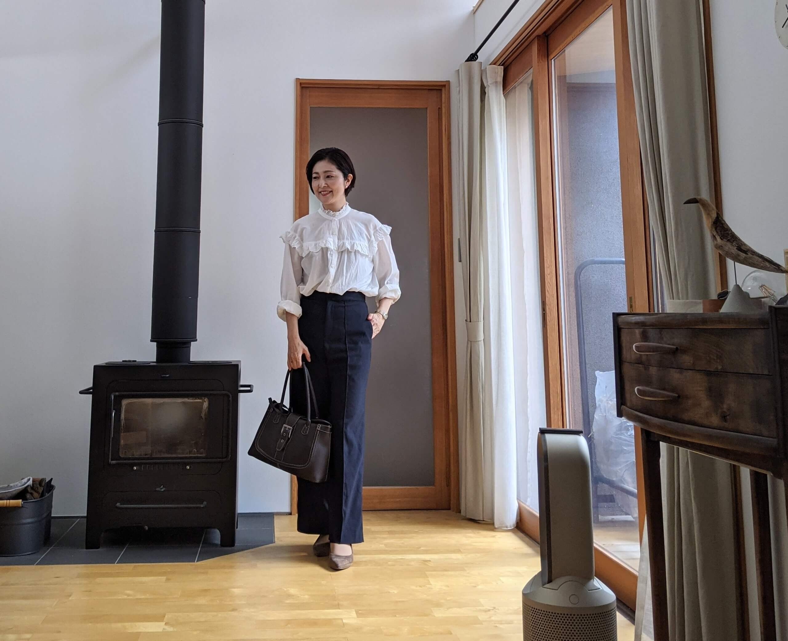 パンツは、去年のユニクロのハイウエストワイドパンツです。パンプスもユニクロ。