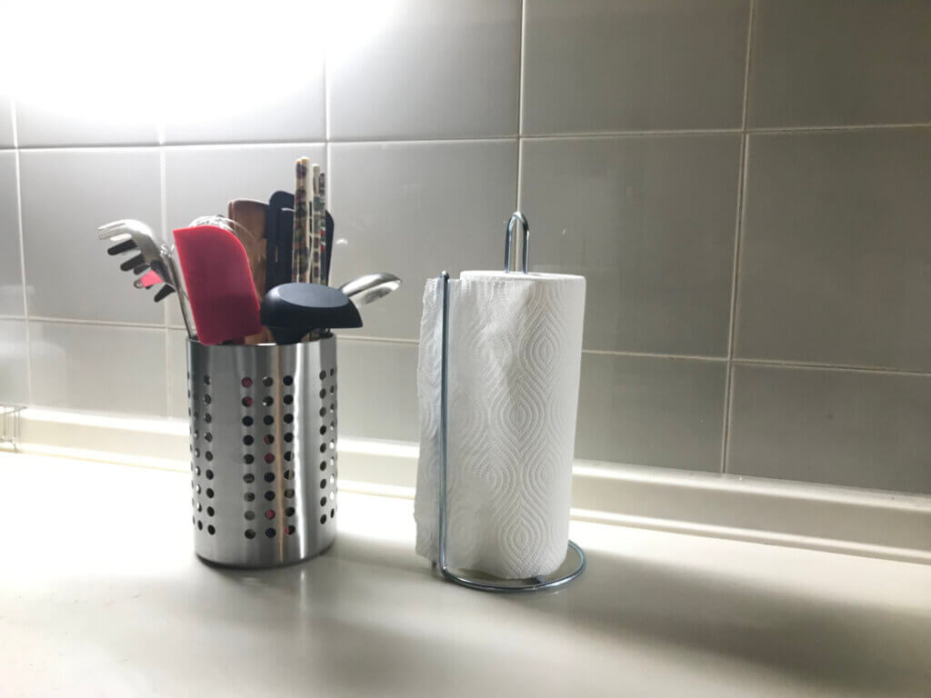 ステンレス製で統一感があるのでカトラリースタンドとペーパーホルダーは収納せず出しておいても変じゃないかな?