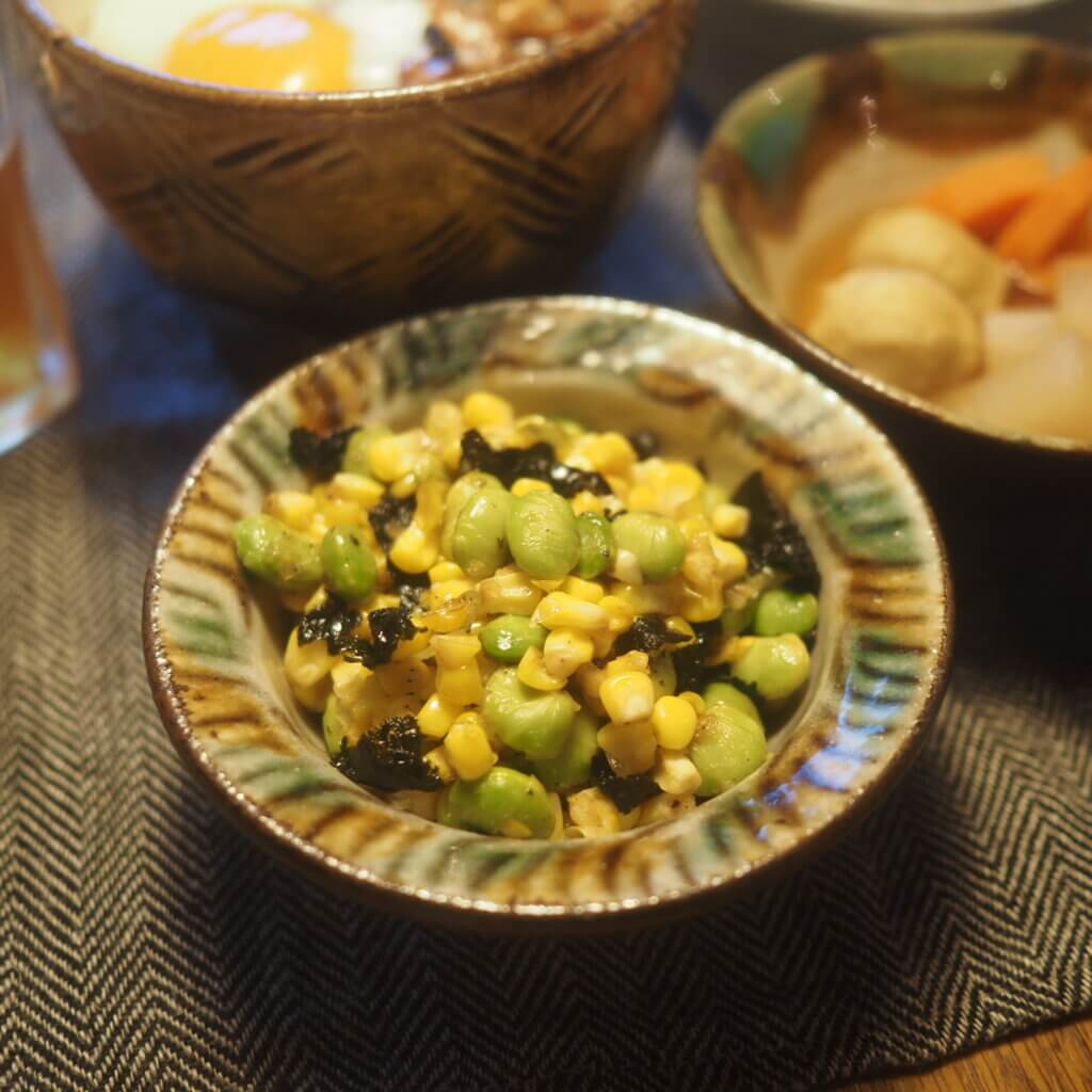 本を参考に作った、とうもろこしと枝豆のバター醤油炒め。