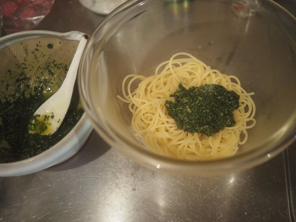 茹で上がったパスタに紫蘇ペーストをたっぷり混ぜて。