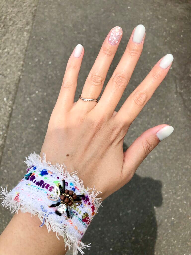ハンドネイルはなじみ色ばかり選びがちだったけれど、シアーカラーなら肌にもなじみやすいです。