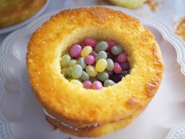 スポンジケーキの丸くくりぬいた部分にブドウとポイフルを入れました。