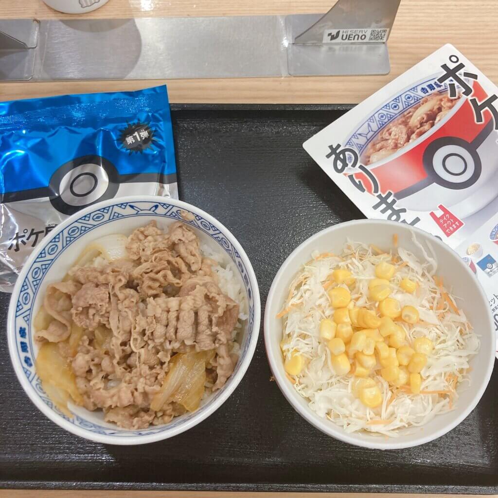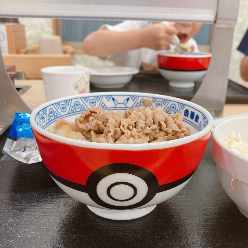 牛丼が入っている器がモンスターボール(ポケだとモンスターを捕まえるためのボール)なのに、親の私もテンションが上がりました。