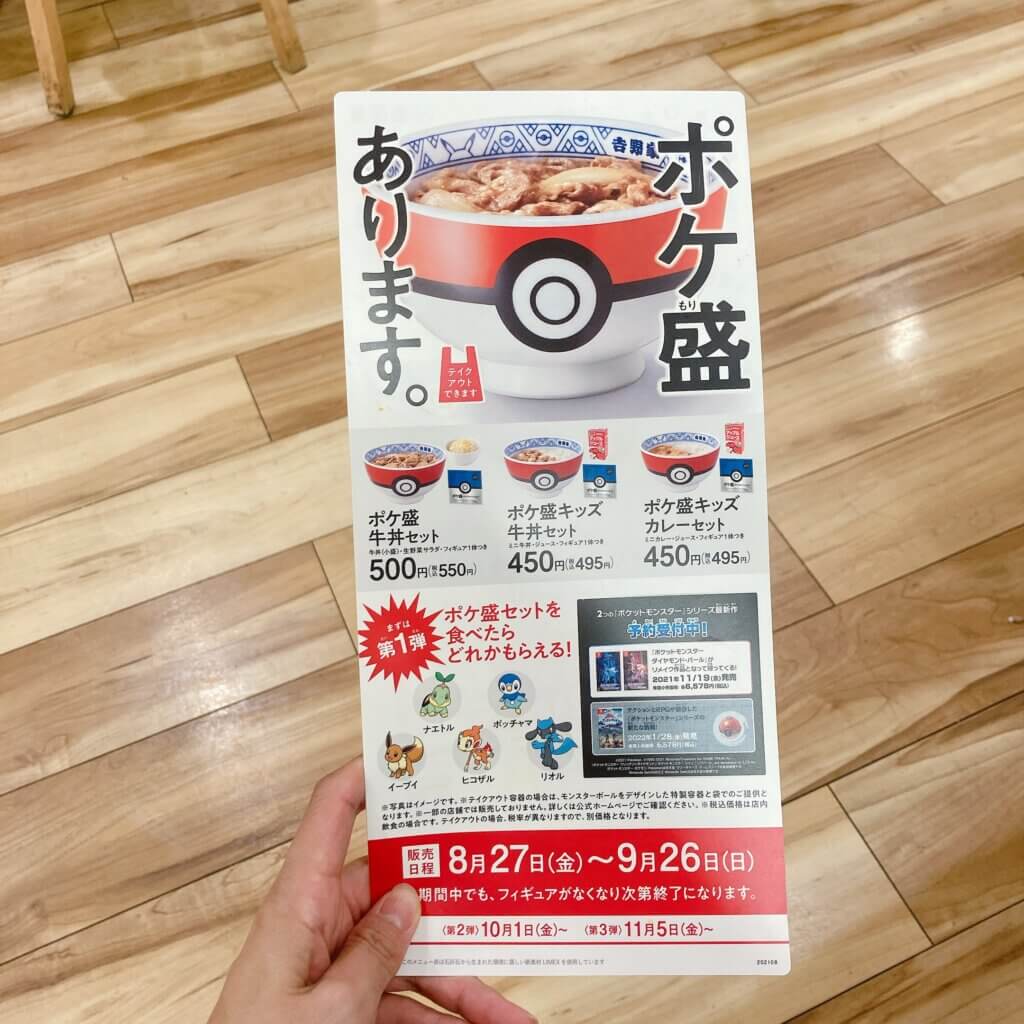 ポケ盛とはなんだろうか?と思って見てみると、牛丼もしくはカレーとサイドメニューに何が当たるかわからないフィギュア付きとのこと!