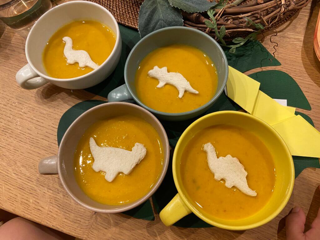 恐竜の型抜きをした食パンを軽くトーストして浮かべました。