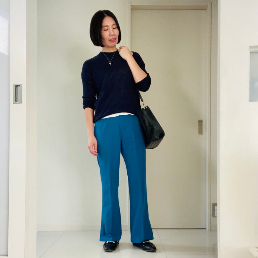 この日は通勤コーデなのですが(カジュアルOKな事務仕事です)濃いめのデニムとパールに合わせてみました。