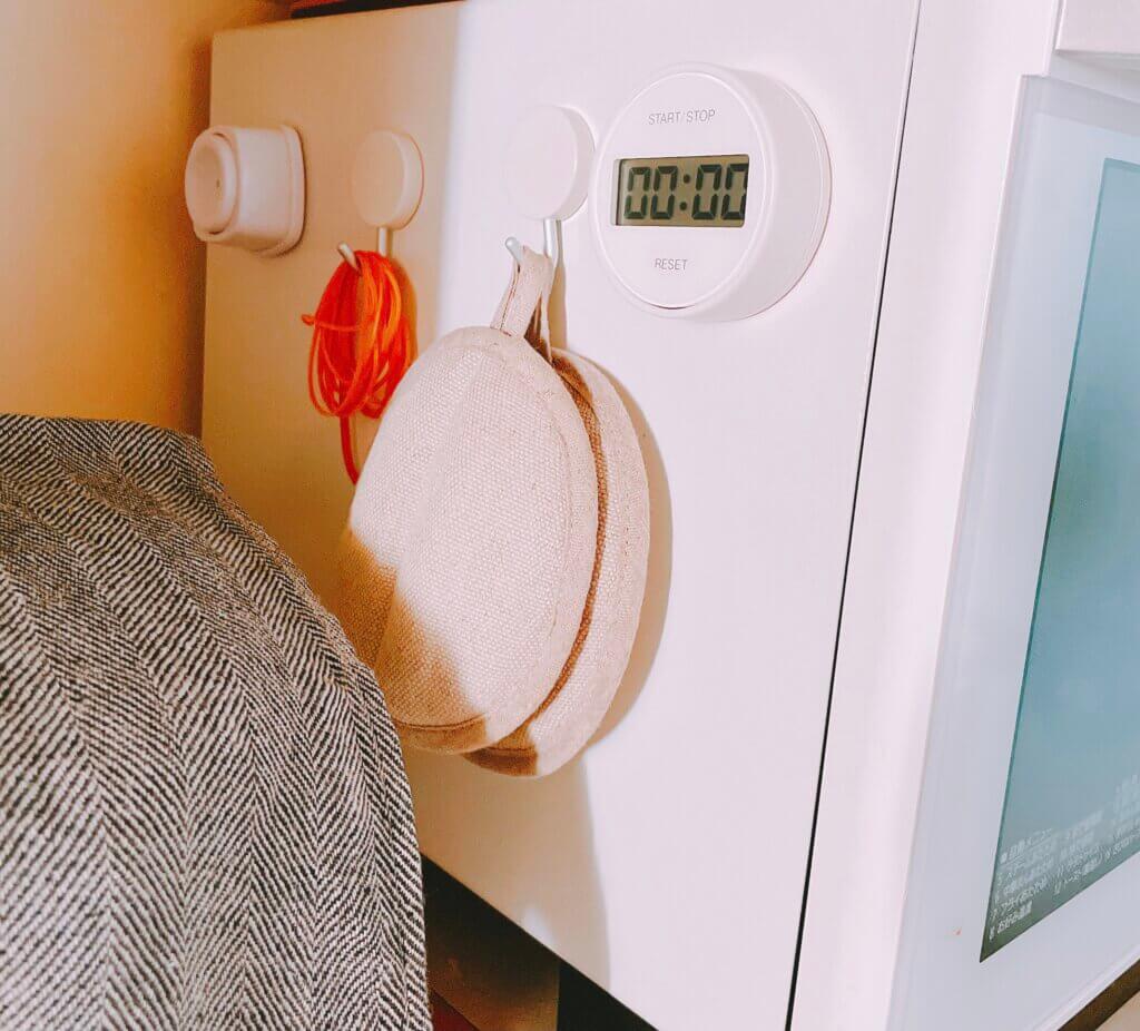 生活感丸出しですみません。マグネットを付けられるところが電子レンジしかなくて…。