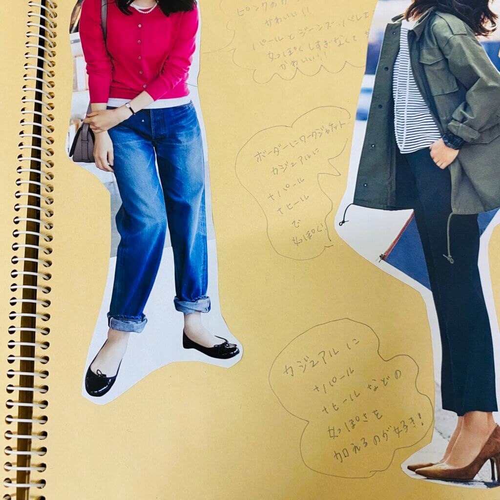 私、何年か前まで雑誌を処分する際は好きなコーディネートを切り抜いてスクラップブックに貼っていました。それを貼らずに切り抜いたまま放置されていたモノがあったので、マイノートのワークショップの時、それを使いました。