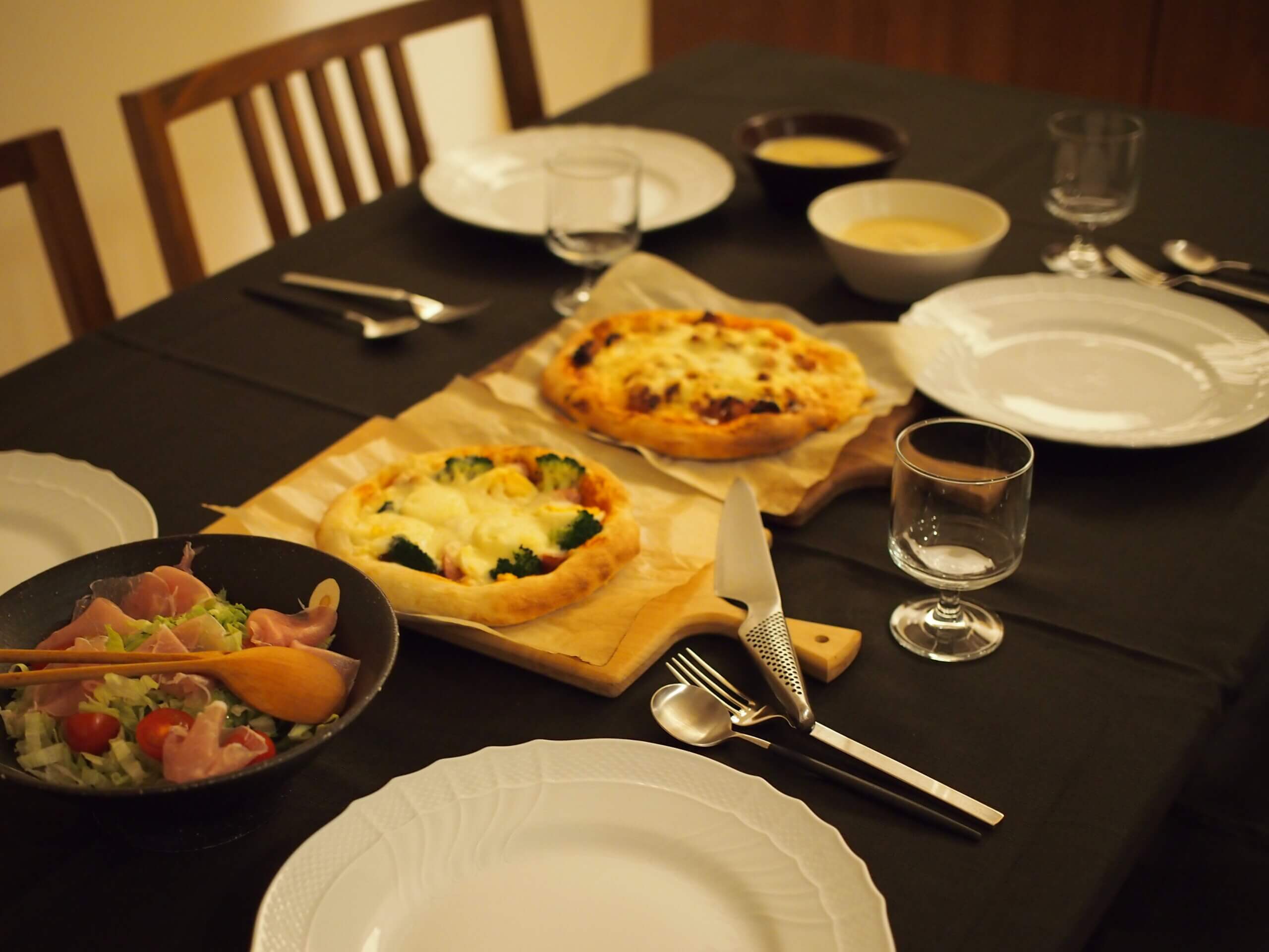 先週末の晩ごはんは、ピザ、さつまいもとキャベツのポタージュ。(ポタージュスープが遠くにしか写っていませんが😂)
