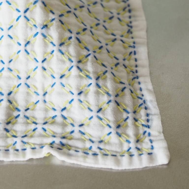ベンチタイムに使う濡れ布巾も「刺し子」で作ったハンドメイドです。