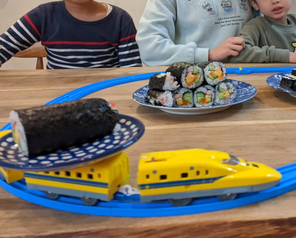 ずっとやってみたかった、プラレール回転寿司を恵方巻で実現しました(笑)