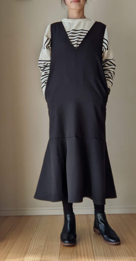 ジャンバースカートはしまむら系列のアベイルで見つけました。意外と私たち世代でも着られる服があって、時々「しまパト」ならぬ「アベパト」を楽しんでます♪