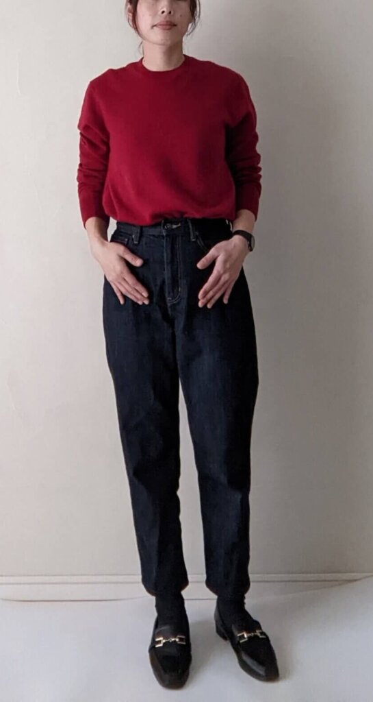 トップスがカジュアルでも大人っぽく見えるよう、カラーはインディゴを選びました。ハイライズと太ももに余裕のあるシルエットのおかげで着やせして見えるのが嬉しいです。
