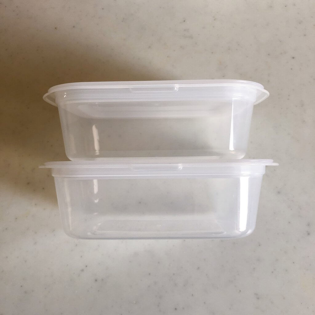 買いだめはやめて、冷凍できるものは冷凍することにしました。100円ショップの容器がなにかと便利です。