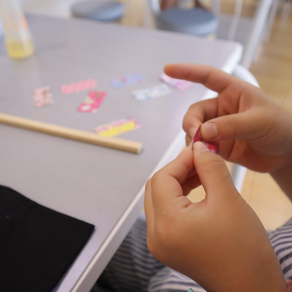 今回は切子のかけらを使ったキーホルダー作りと竹細工を、小学1年生の娘が体験しました。