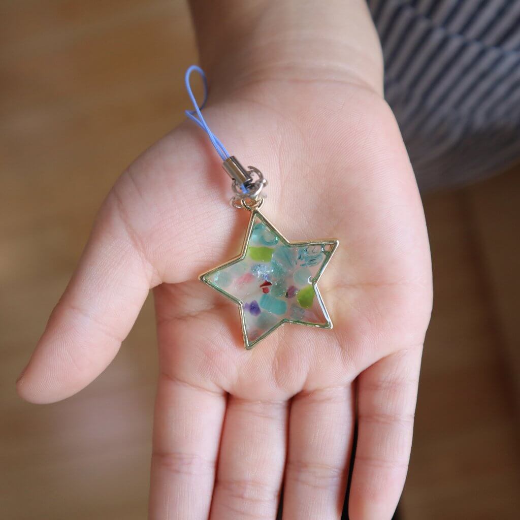 キーホルダー作りは、好きな枠を選び、切子のこまかなかけらを好きなように詰め込んでいきます。