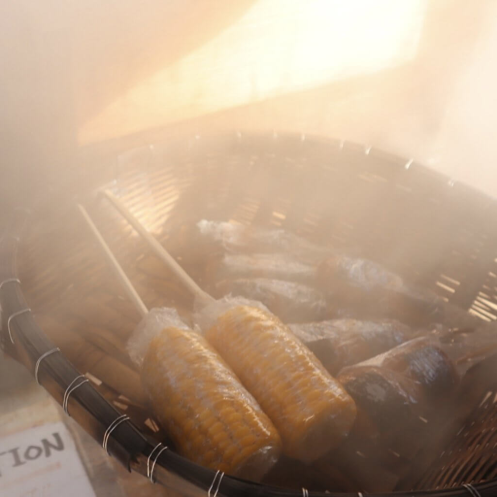 霧島温泉郷の中心にある「霧島温泉市場」の広場では、足湯や、温泉の蒸気で蒸した卵や野菜などが販売されています。