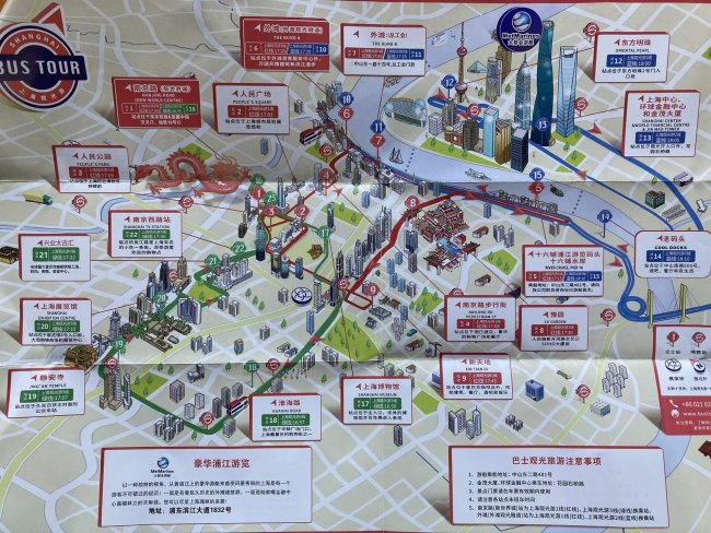 私達が参加したBUS TOURには赤、青、緑ラインがあり、今回は赤(人民广场〜外滩)、青(外滩〜浦东)の2ラインに乗車。24h乗り放題なのでなんと翌日にも遠征して乗りに行ったほど。(時間ないのに)